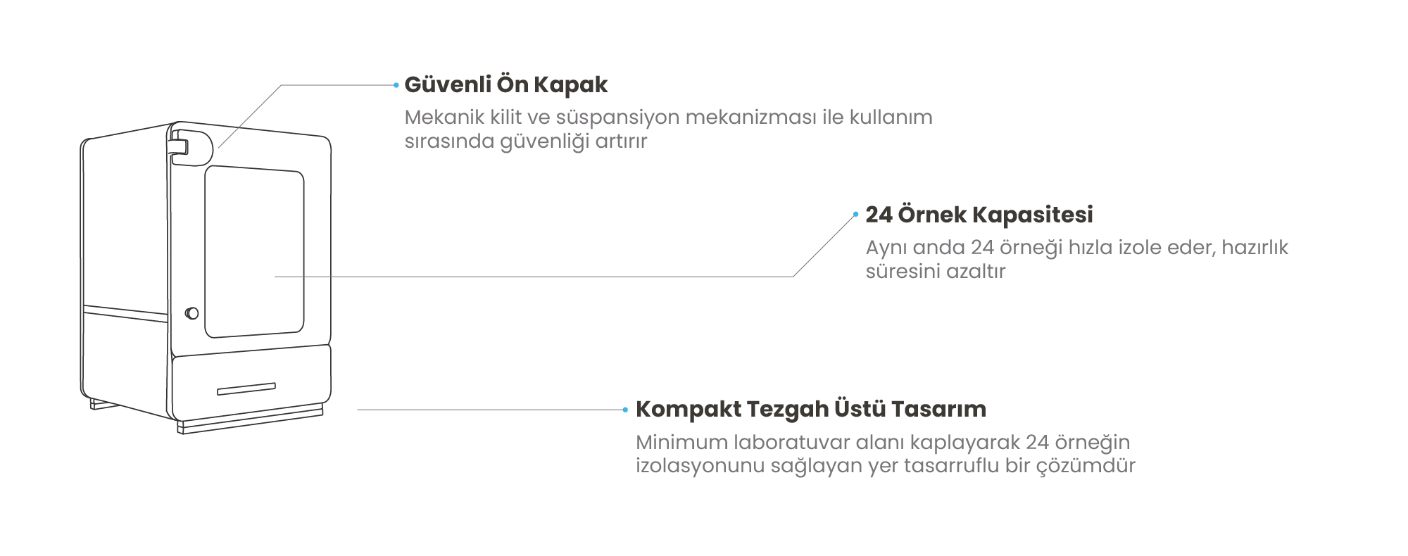 UNIO B24 İzolasyon Sistemi, çeşitli biyolojik örneklerden (tam kan, serum, plazma vb.) ve gıda örneklerinden (et, süt, tohum, yem, jelatin vb.) nükleik asitlerin (DNA/RNA) otomatik izolasyonu gerçekleştirmek amacı ile geliştirilmiş bir laboratuvar cihazıdır. Paramanyetik partikül tabanlı teknoloji sayesinde hızlı, saf ve kontaminasyondan arındırılmış nükleik asit izolasyonu sağlar ve minimum düzeyde manuel müdahale gerektirir.