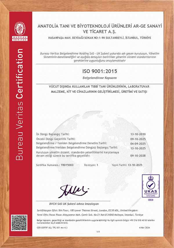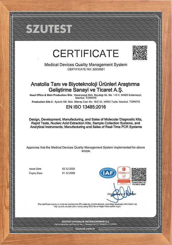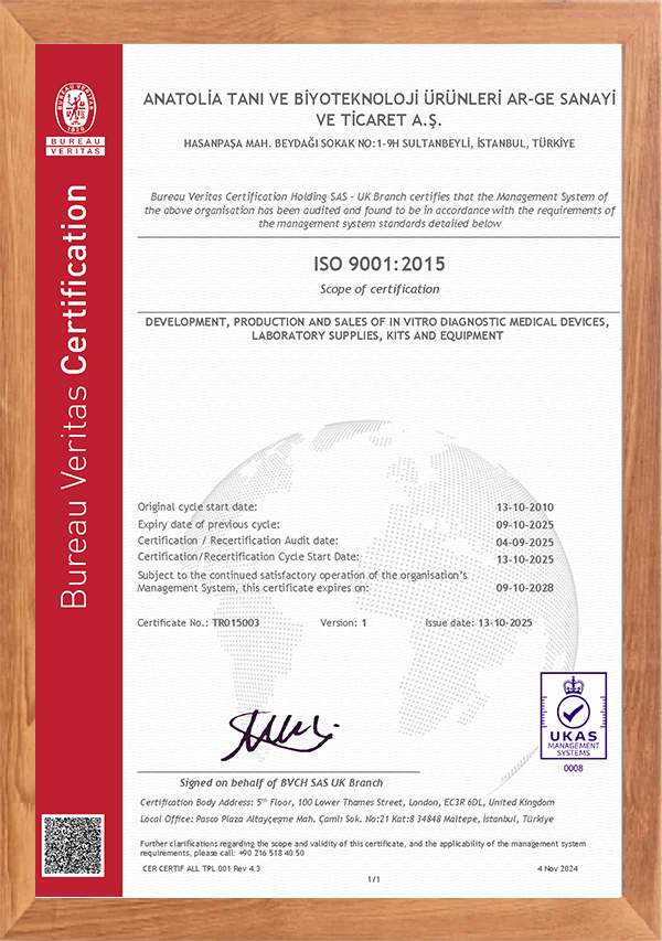 Anatolia Tanı A.Ş. appreciates the functional working system that has been established through creative solutions, enabling us to operate effectively independently of individuals. We are committed to achieving our quality objectives and long-term success by adhering to ethical values and complying with the legal requirements, regulations, and customer and contractual conditions related to the TS EN ISO 9001:2015 standard, TS EN ISO 13485:2016 standard, In Vitro Diagnostic Medical Devices Regulation (EU 2017/746 IVDR), IVD Directive 98/79/EC (during the transition period), and Machinery Safety Regulation (2006/42/EC