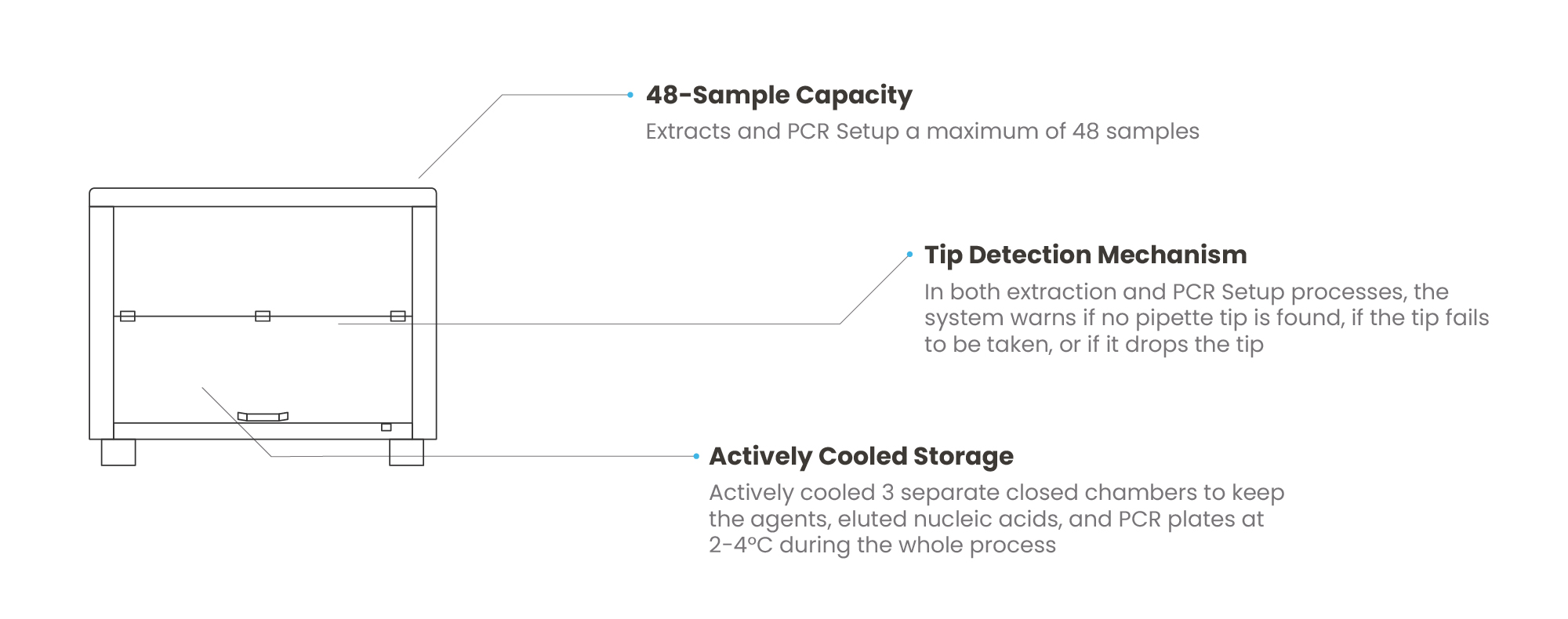 Magnesia 2448 is a compact, flexible, high-end nucleic acid extraction and PCR Setup system that can safely handle multi-parameter assays with just several minutes of hands-on time.