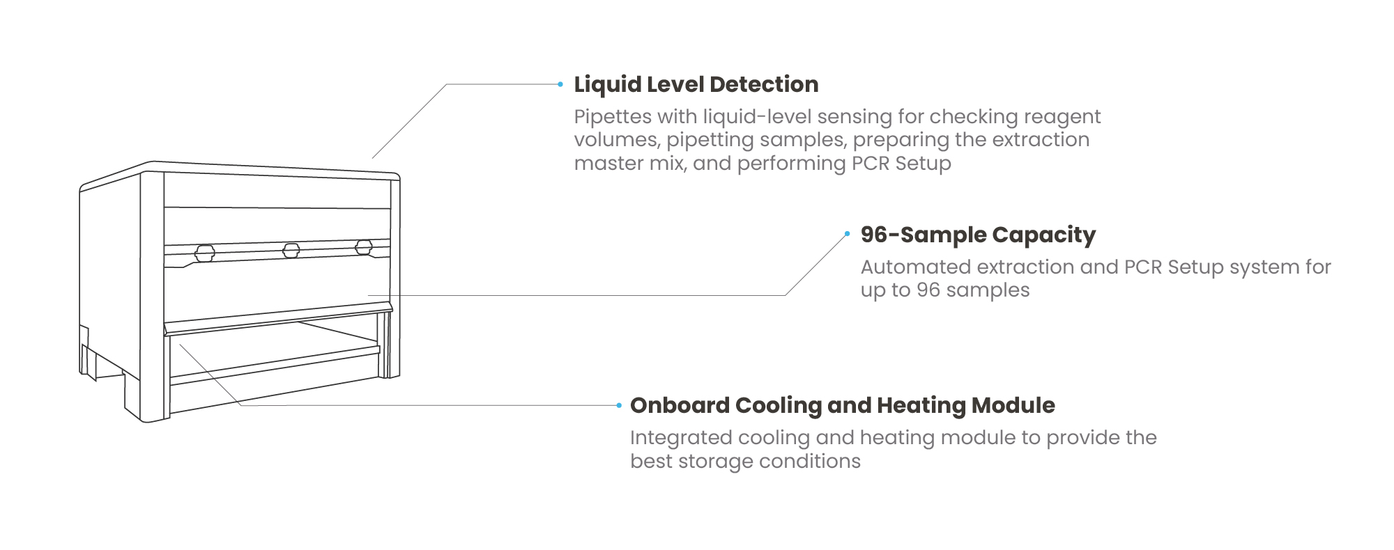 UNIO 96 Extraction & PCR Setup System is designed and developed for automated extraction of DNA/RNA from different sources including body fluids originating from different biological sample materials (serum, blood, plasma, nasopharyngeal swabs, oropharyngeal swabs) and also enables the PCR setup to be performed after the automated extraction of nucleic acids.
